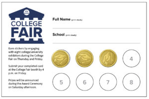 - By engaging with a select number of College Fair exhibitors, student can complete a College Fair Card and enter to win a College Swag Bag. Swag bags are donated by College Fair exhibitors and announced during the Awards Ceremony.